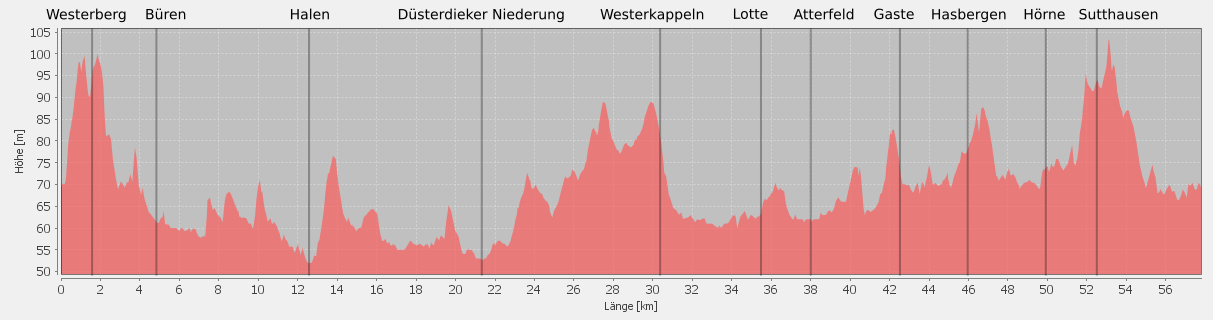 Hauptstraßen bis zum Dütetal. Kurz danach erreichen wir Sutthausen und gelangen über