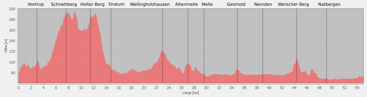 gleichmäßiger Steigung bergauf bis Holsten-Mündrup und auf den Schnettberg.