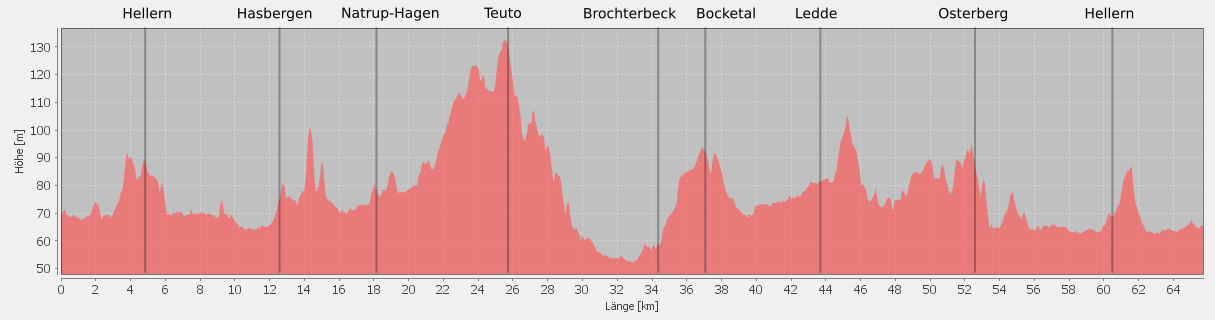Wir fahren nun ein paar Kilometer nördlich und gelangen über vertraute Strecken bis südlich von Tecklenburg. Von hier aus erreichen wir die Bauernschaft Wechte, die wir über verwinkelte Sträßchen parallel zum Teuto durchfahren bis Brochterbeck. Hier kehren wir in der Bäckerei Schlemmerback ein.
