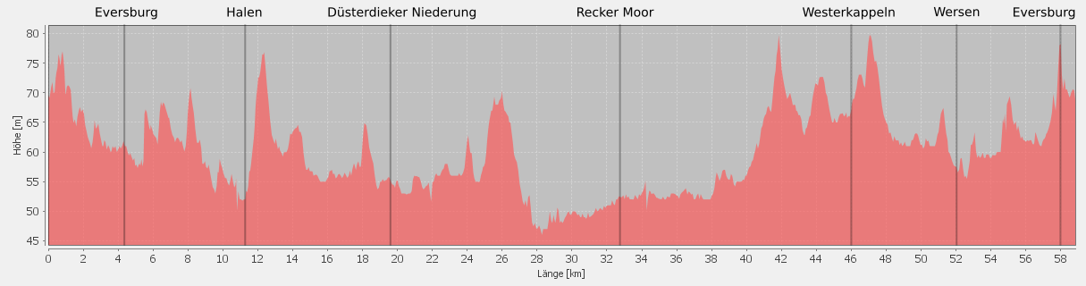 „Recker Moor“ zu. Die teils wellige Fahrbahn lässt erahnen, dass der Boden darunter mal zum Moorgebiet