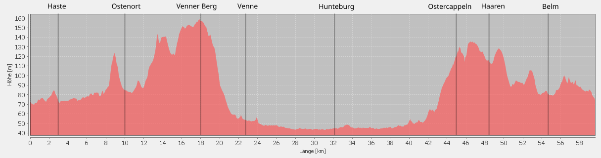 der B 51 bis kurz vor Belm. Weiter geht es der Länge nach durch Belm und weiter auf dem Radschnellweg zurück
